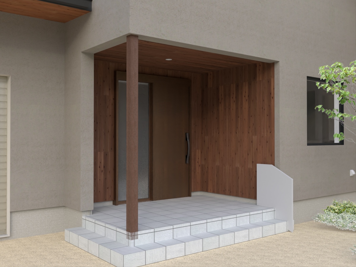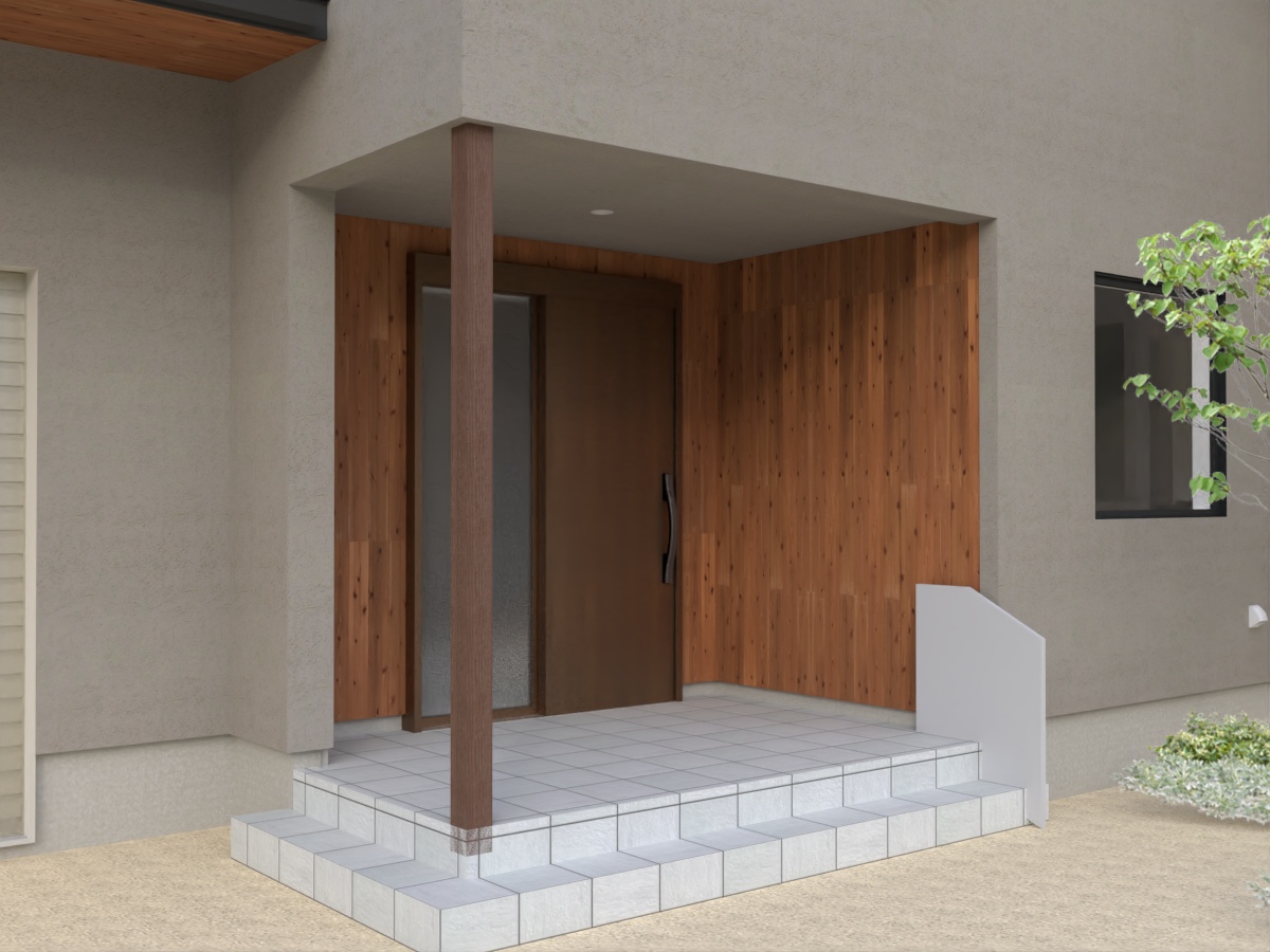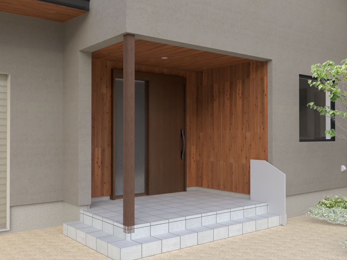 当初は軒天に木を張る案が有力でしたが、玄関ドアの木目と干渉してしまうため、天井はスッキリと外壁と同じ塗り壁(エコサーム)で仕上げることにしました。