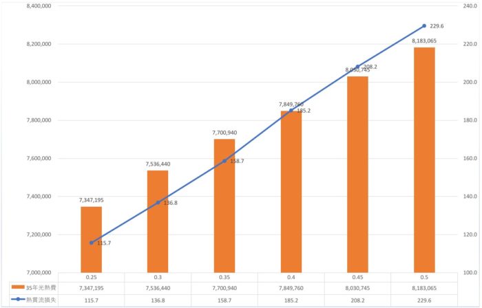 35年光熱費は、0.5と0.25で、約84万円差。この額を大きいと見るか小さいと見るか、人によって別れると思います。