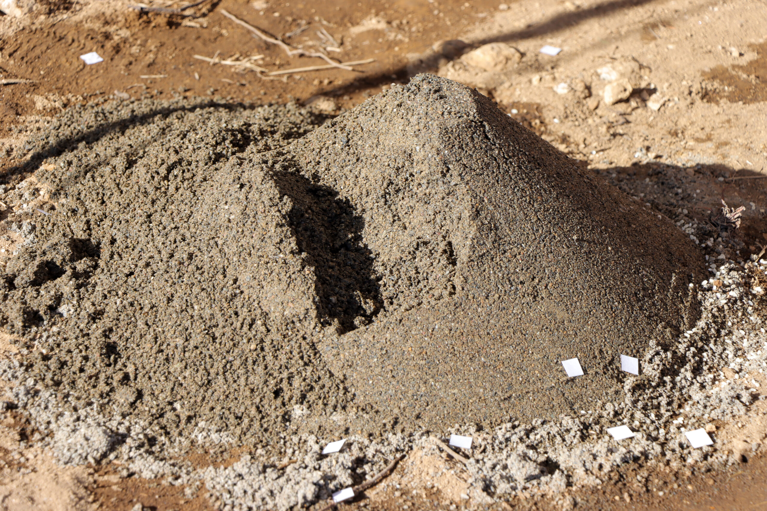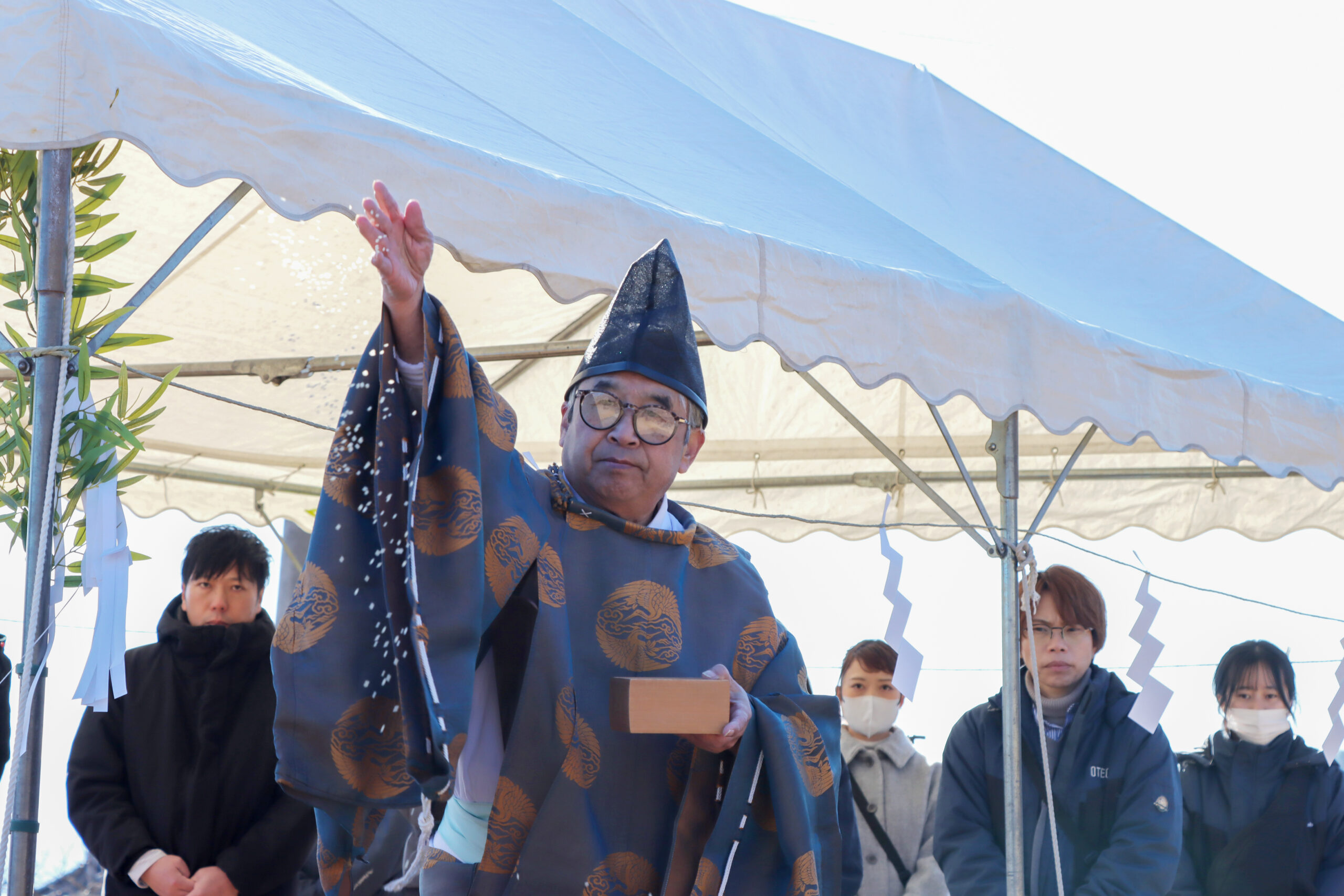 神主さんが敷地の四方に切麻(紙を細かく切ったもの)やお米をまき、土地を清める儀式です。