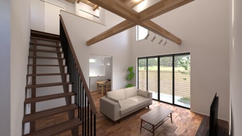 大きな吹抜のある二階建てのお家です。オープンなリビング階段で家族のつながりが感じられるリビングとしました。