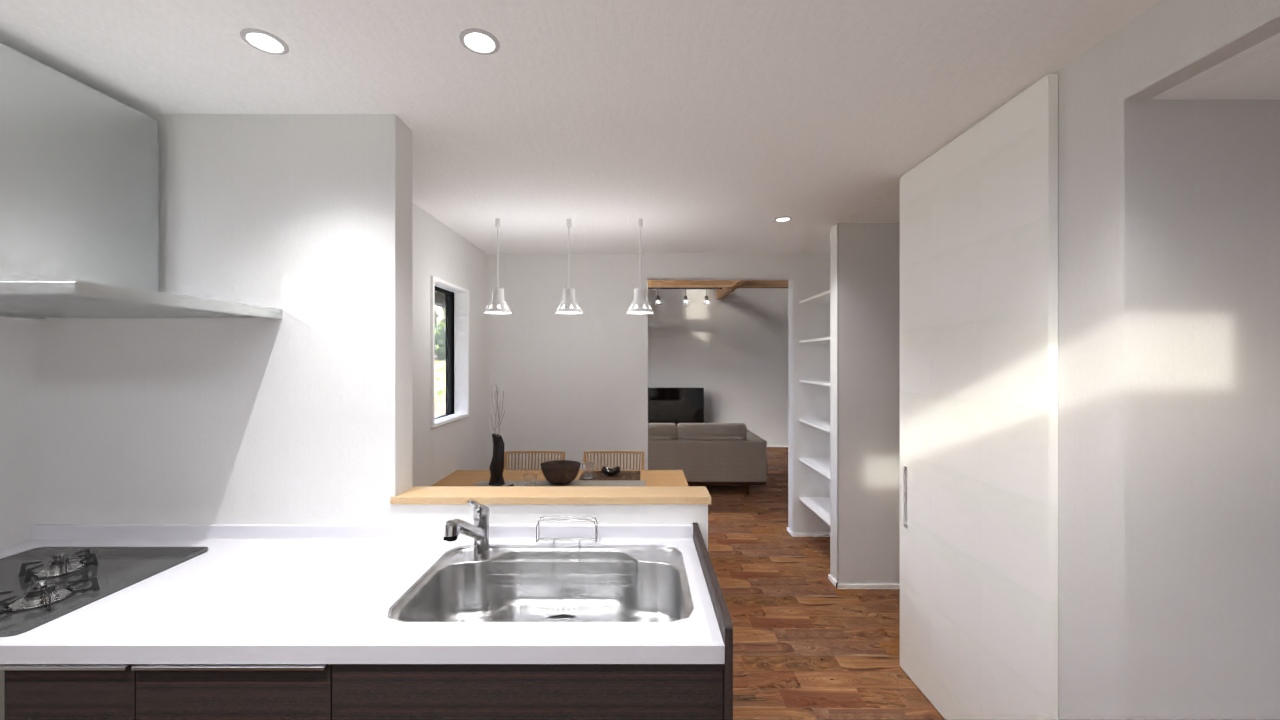 ダイニングキッチンはリビングの空間と緩やかに仕切り、落ち着いて食事ができる空間にしています。子供さんのランドセルや勉強の道具などの収納をダイニング周辺に設け、家事をしながら勉強を見てあげられる配置になっています。