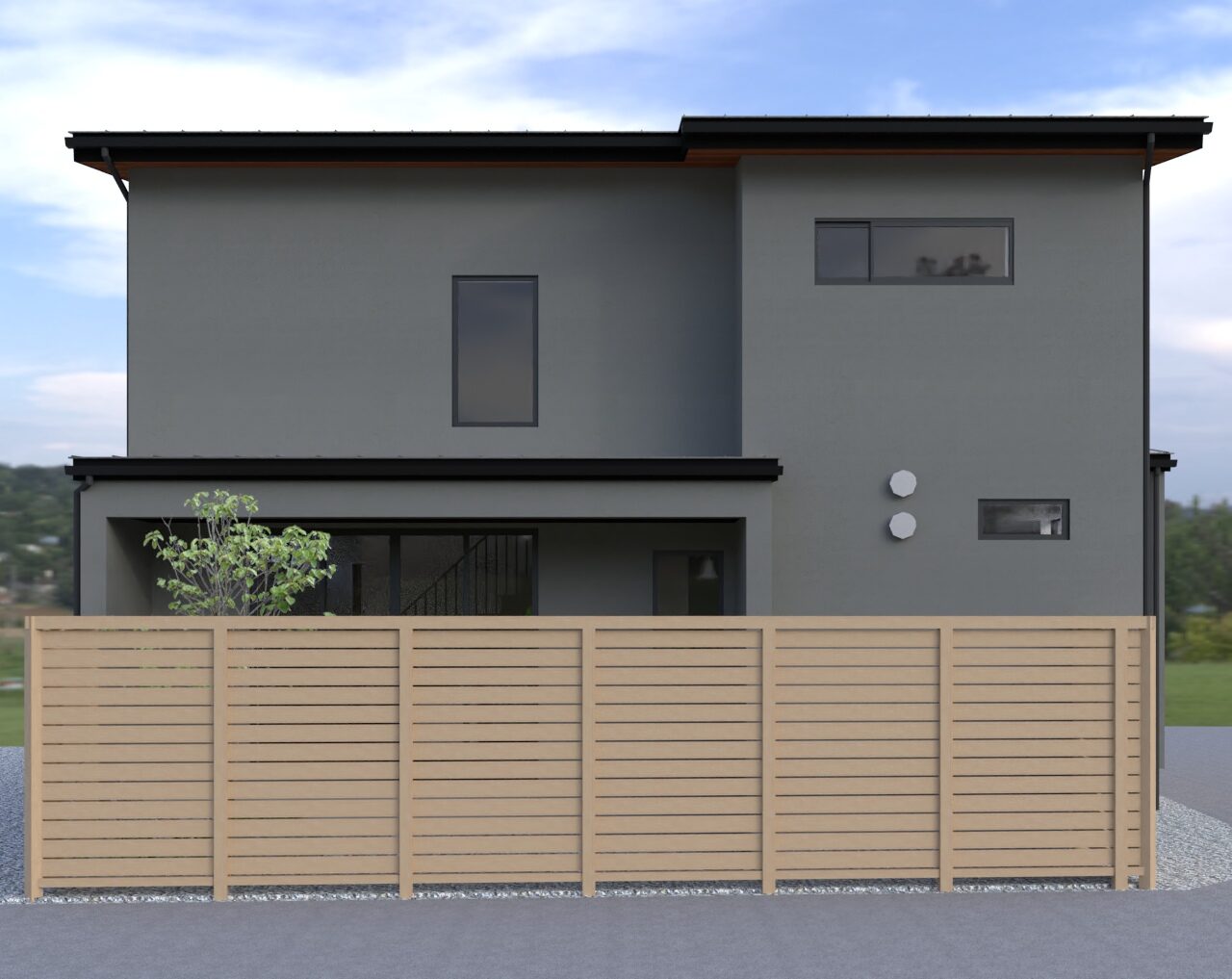 外壁は継ぎ目のない左官仕上げができ、ダブル断熱による高性能な外壁「エコサーム」を採用しています。汚れが目立たない濃いグレー色で落ち着いた雰囲気となっています。