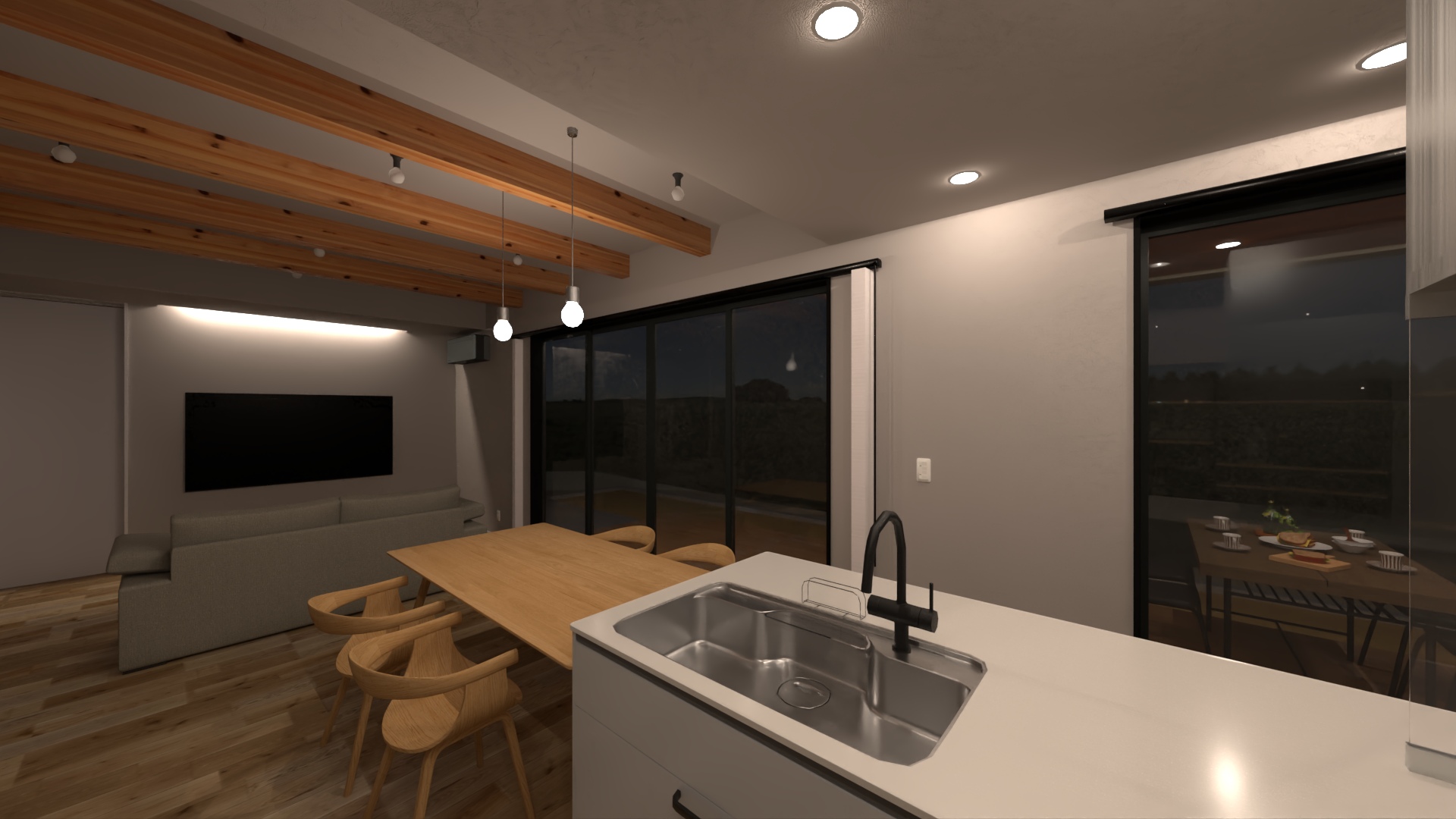 ゆったりくつろぎたい時はテレビ上に間接照明と、ダイニング上のペンダントライトだけ点灯し、メインの照明を絞ると、しっとりとしたくつろぎ空間に。