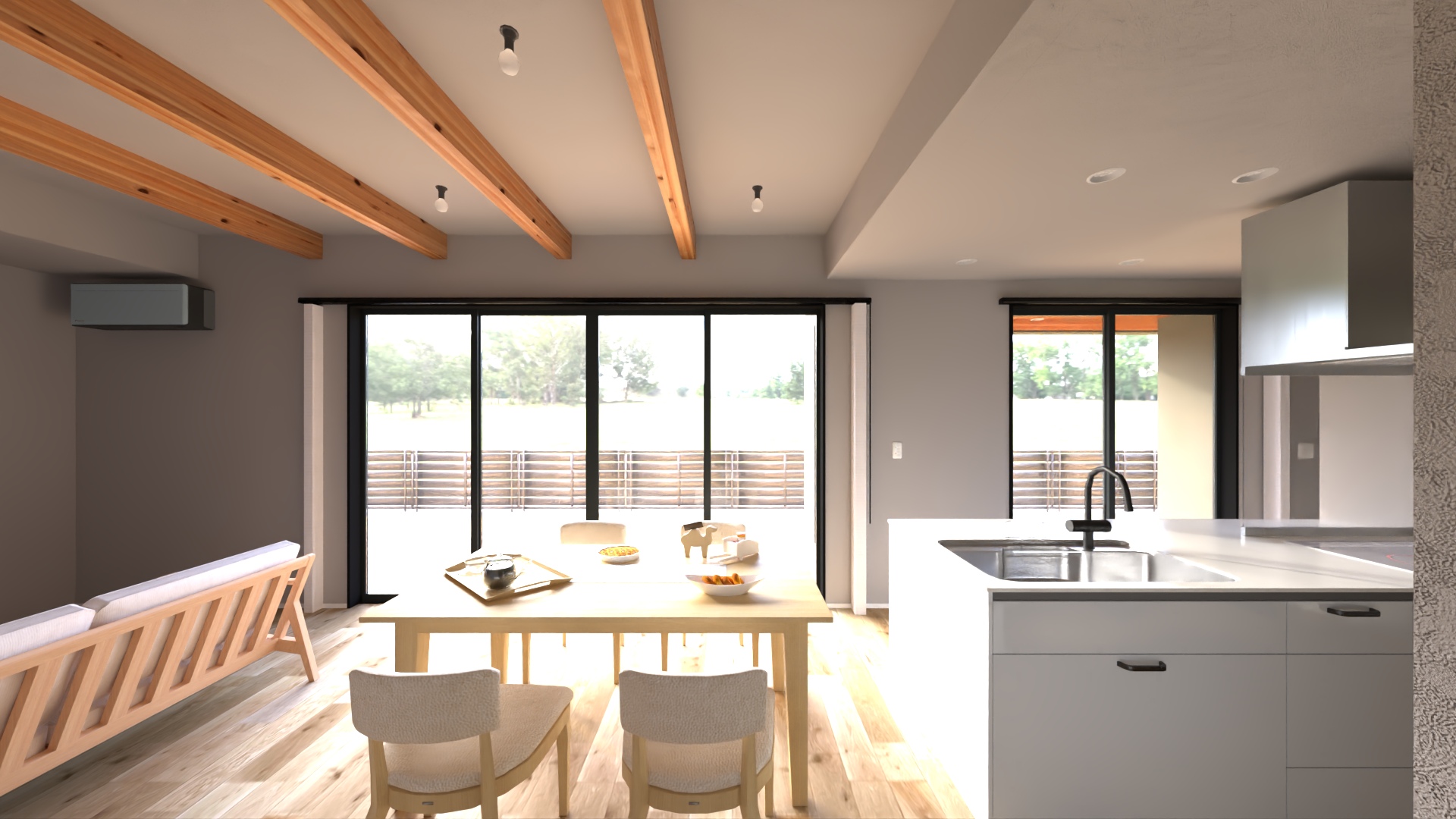 キッチン前は深い屋根のあるウッドデッキで、雨が降っていても外を楽しめます。