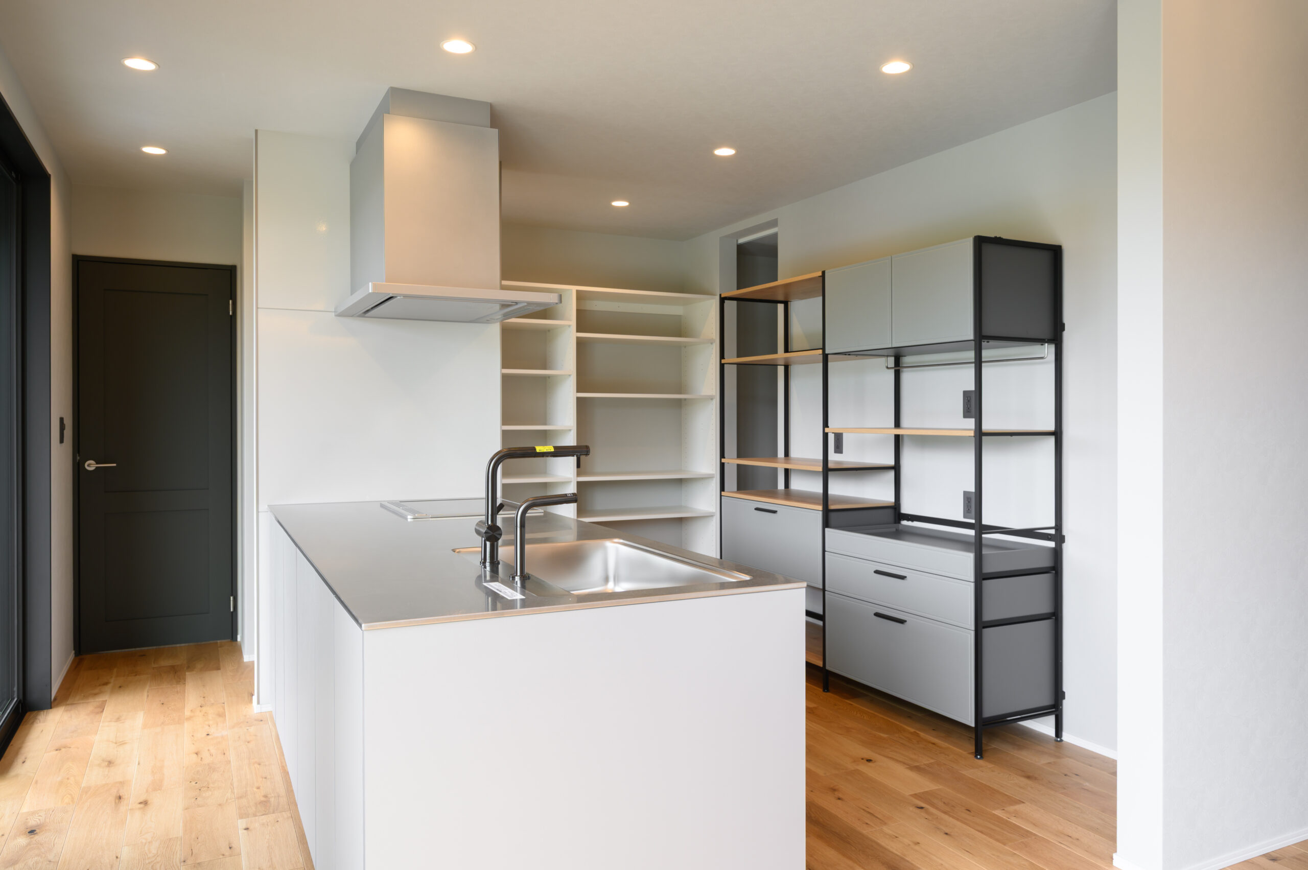 キッチンにはTOTOのキッチンとリクシルのカップボード「カノール」を採用し、内装とマッチしたデザインに。