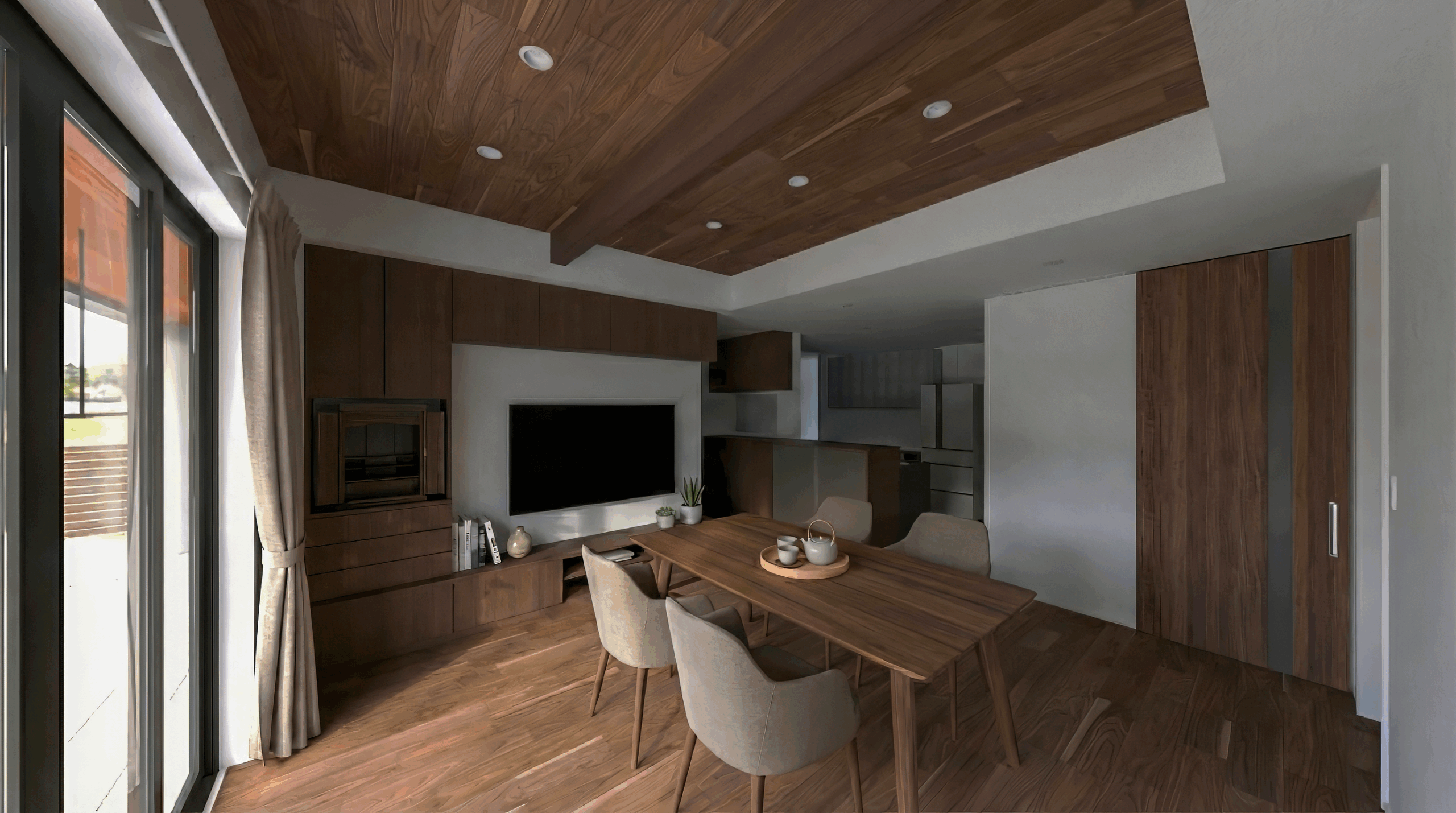 床や建具、天井の羽目板にはウォールナットの色味を採用し、全体を落ち着いた濃いトーンで統一。