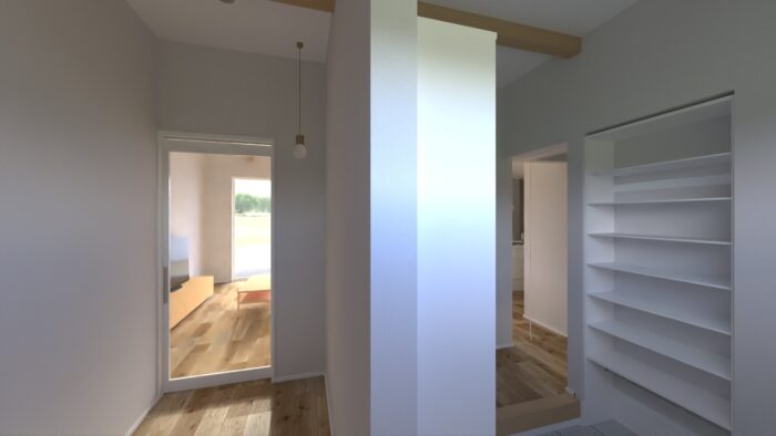 ・玄関ホールと家族用玄関を区切ったことで、スッキリ!家族用玄関には、靴や傘、コートも掛けられる大容量の収納を設置しました。照明にもこだわって素敵な空間でお客様をおもてなし。