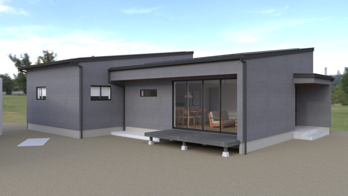 高性能はあたりまえ。デザインにも力を入れています。大きな太陽光が載った片流れの屋根と玄関庇の水平ラインを組み合わせたシンプルで飽きの来ないデザインです。