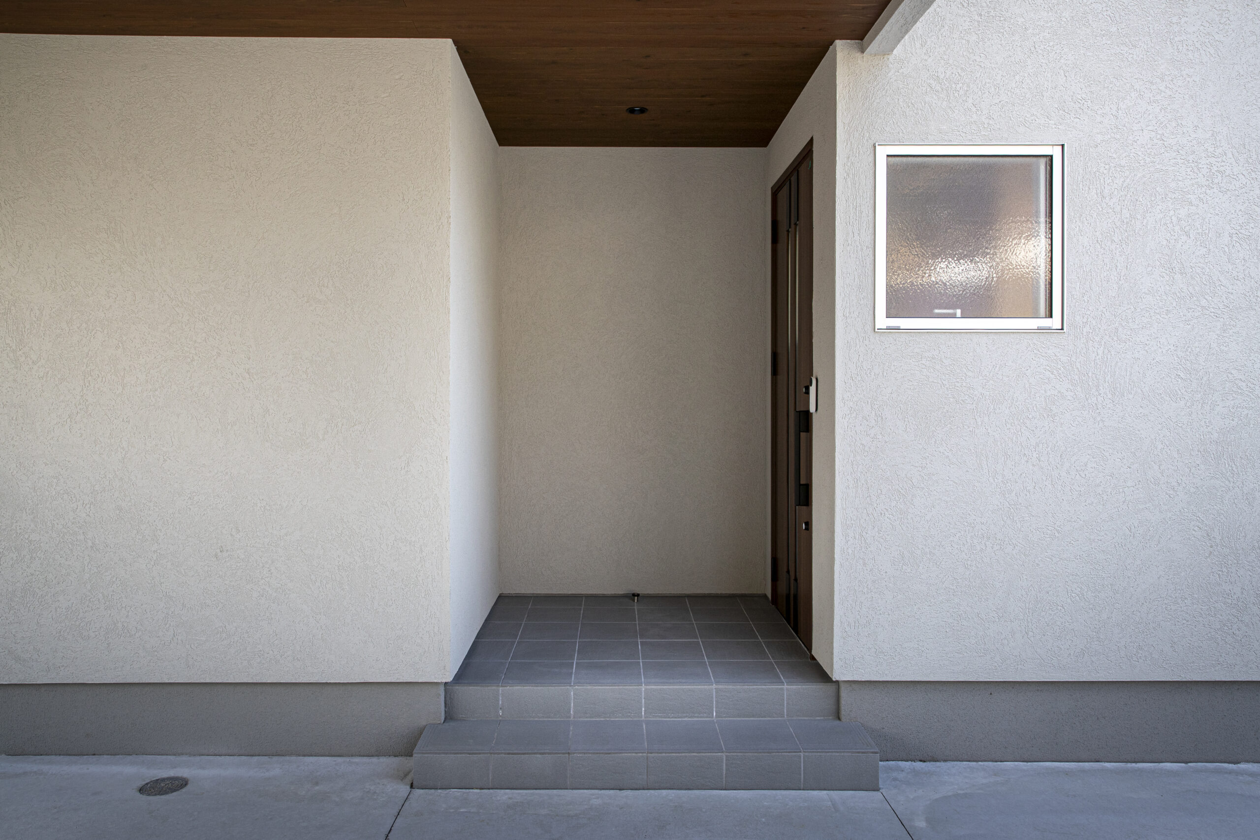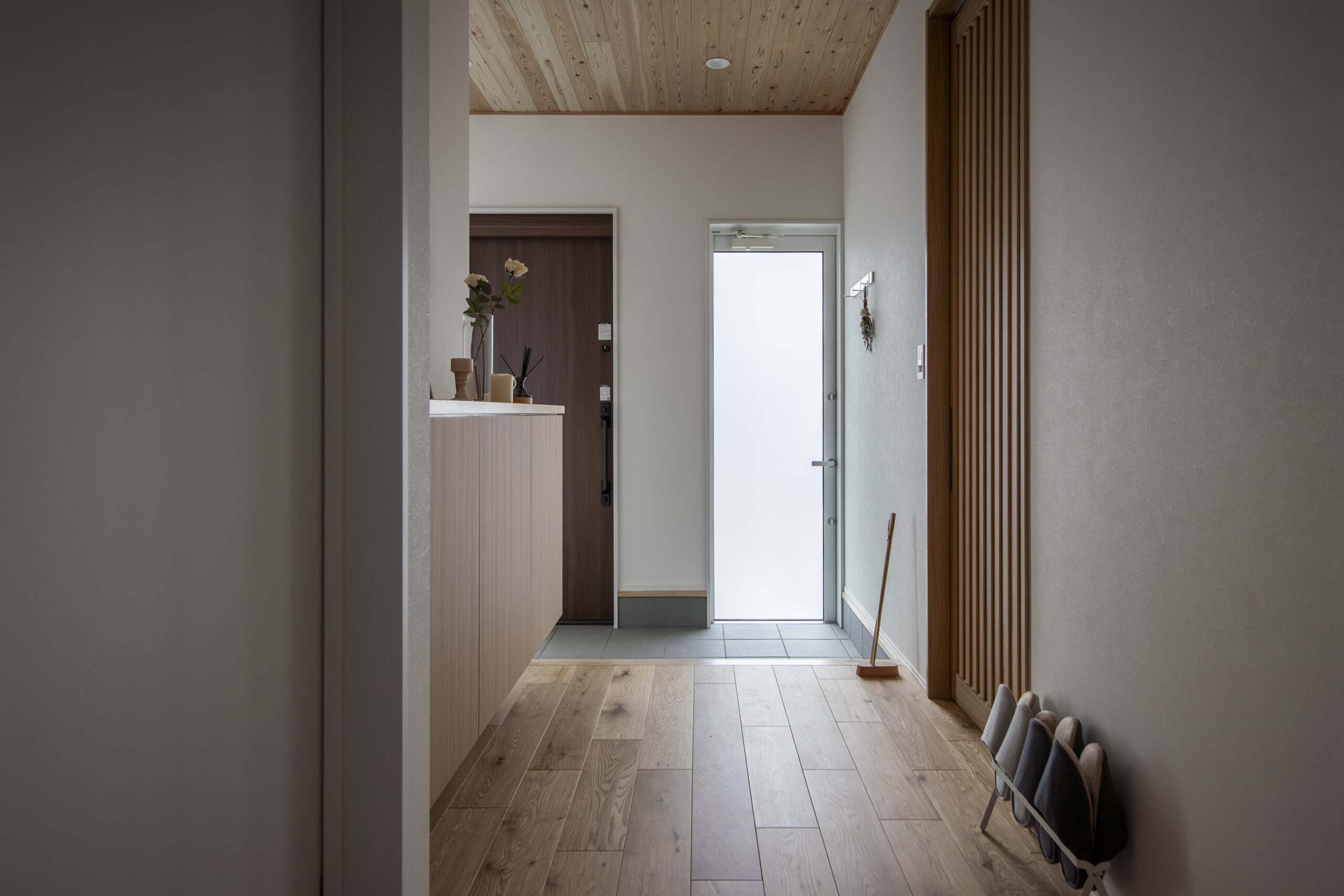 南に面しており、玄関引き戸の袖ガラスから明るい光が差し込みます。