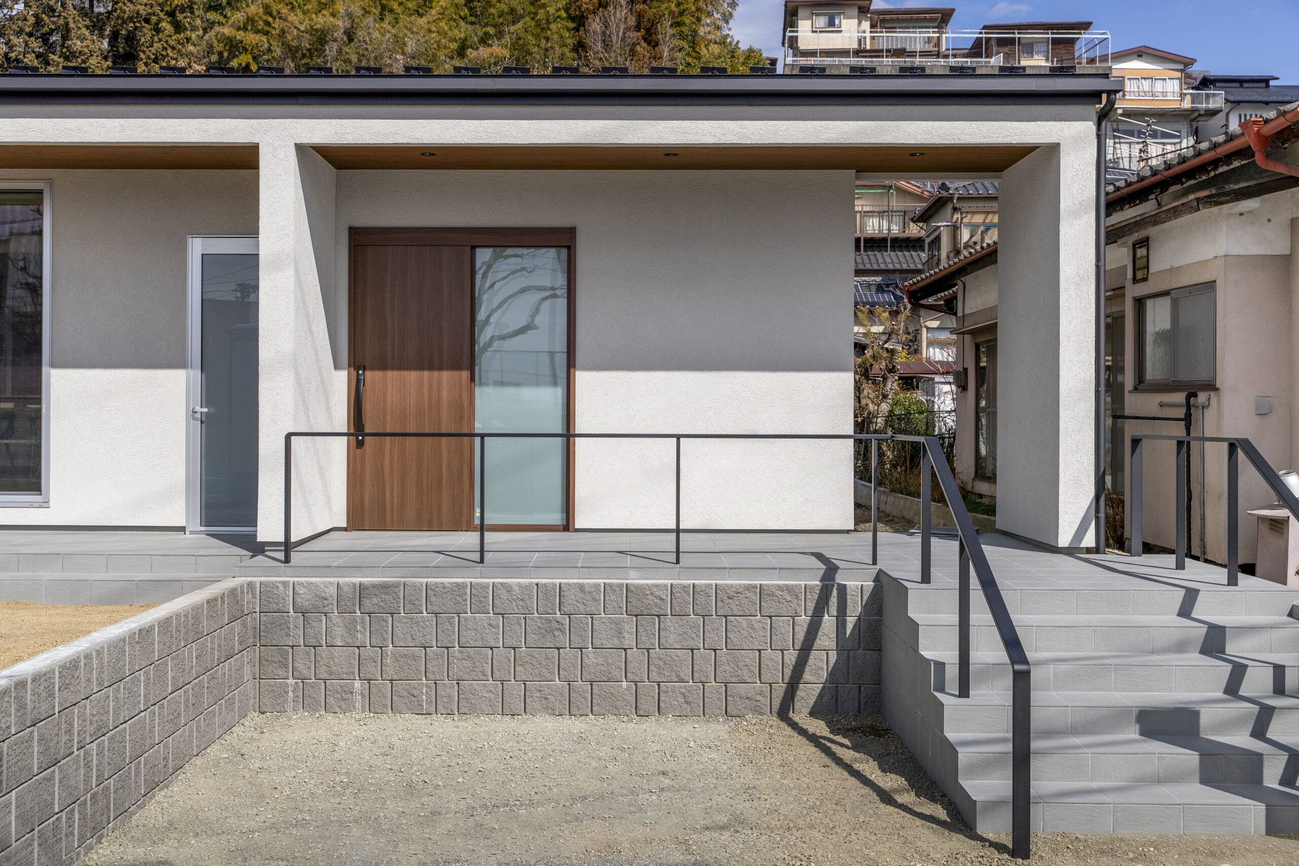 玄関前に深く低い庇を出し、落ち着いた外観と、夏と冬の日差しを考慮したデザインとしました。