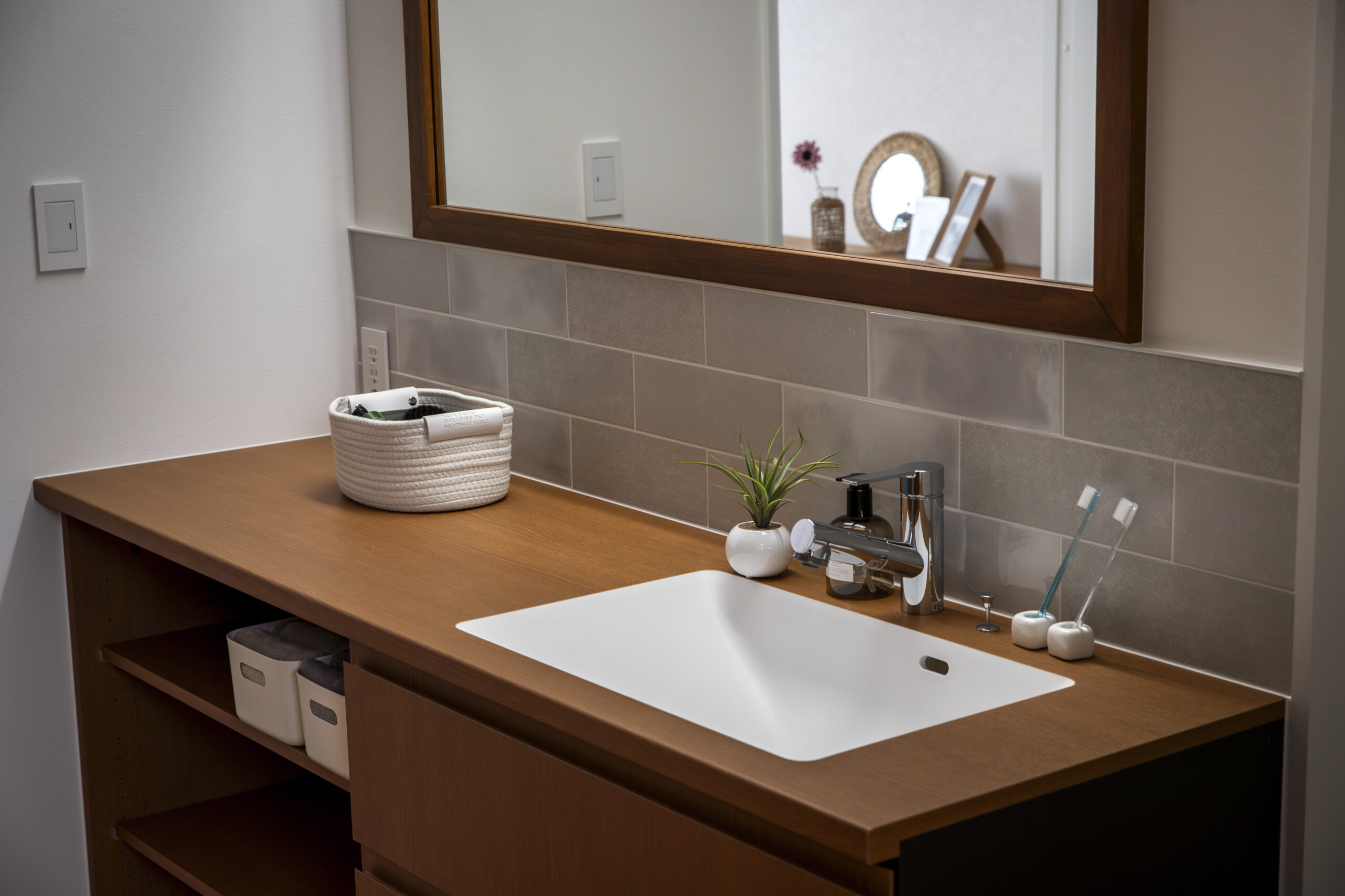 洗面台は二人並んで使える広さ。ボウルとカウンターに段差がなく、掃除もラクラク!