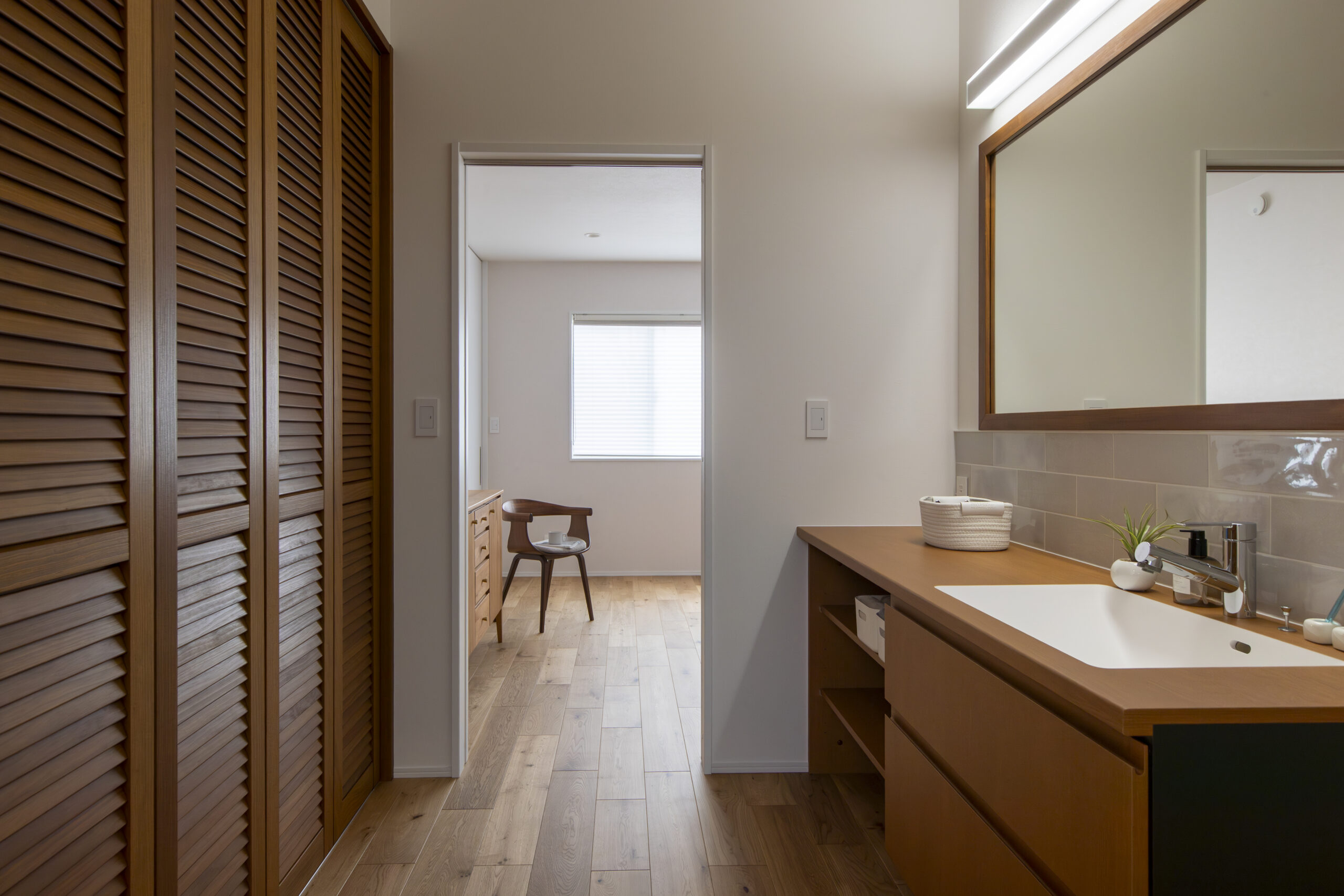 洗面室には通気性の優れた無垢の建具、ピノアースを採用したクローゼットを作りました。