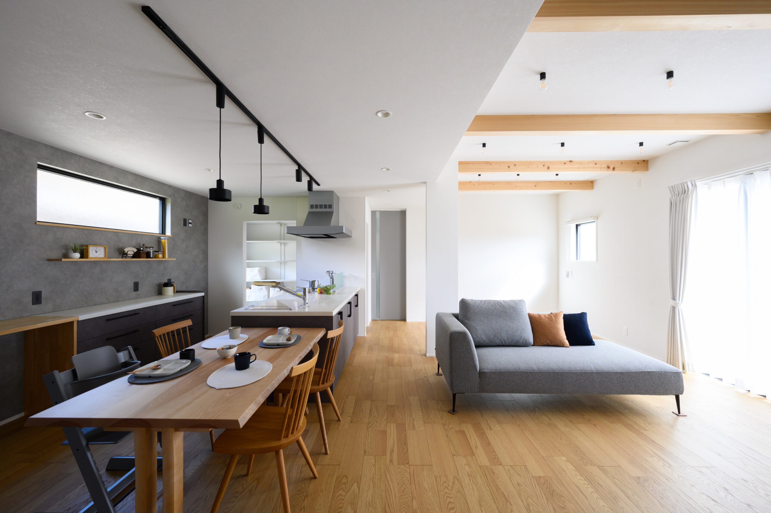 キッチンはカップボードと高さを合わせた造作棚を設置し、ゴミ箱が使いやすいようにしました。キッチンとダイニングのライトは、ライティングレールを採用し、すっきりとした空間になりました。