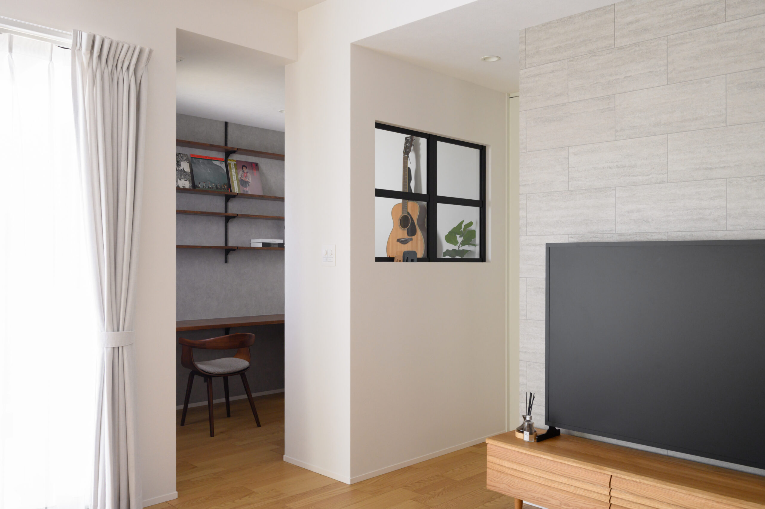 室内窓のある書斎は、リビングとゆるやかにつながっています。 趣味のギターや集めたCD・レコードを飾り、リビングからも楽しめる空間になっています。