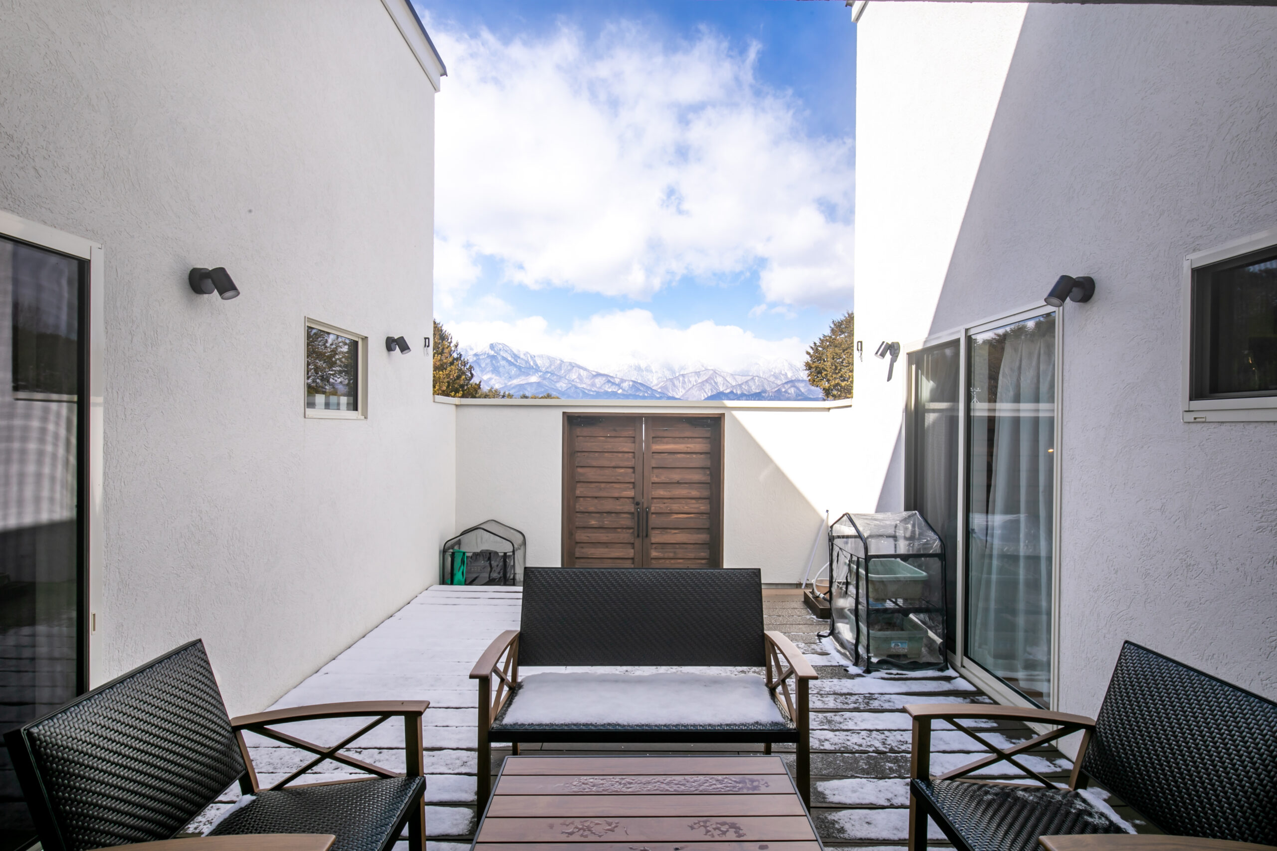 山を一望できる中庭のある家